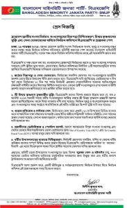 ২. শ্রী চিন্ময় কৃষ্ণদাস ব্রহ্মচারীর মুক্তি: বিএমজেপি তাদের বিশেষ প্রস্তাবে উল্লেখ করে যে, গত ৫ আগস্ট ২০২৪-পরবর্তী সময়ে ধর্মীয় সংখ্যালঘুদের অস্তিত্ব রক্ষায় শ্রী চিন্ময় কৃষ্ণদাস ব্রহ্মচারী আশার আলো জাগিয়েছিলেন। তাকে মিথ্যা মামলায় বন্দি রাখা হয়েছে। নির্বাচন সুষ্ঠু ও অংশগ্রহণমূলক করতে এবং সংখ্যালঘুদের আস্থা অর্জনে অনতিবিলম্বে এই ধর্মীয় ব্যক্তিত্বের নিঃশর্ত মুক্তি দাবি করা হয়েছে।