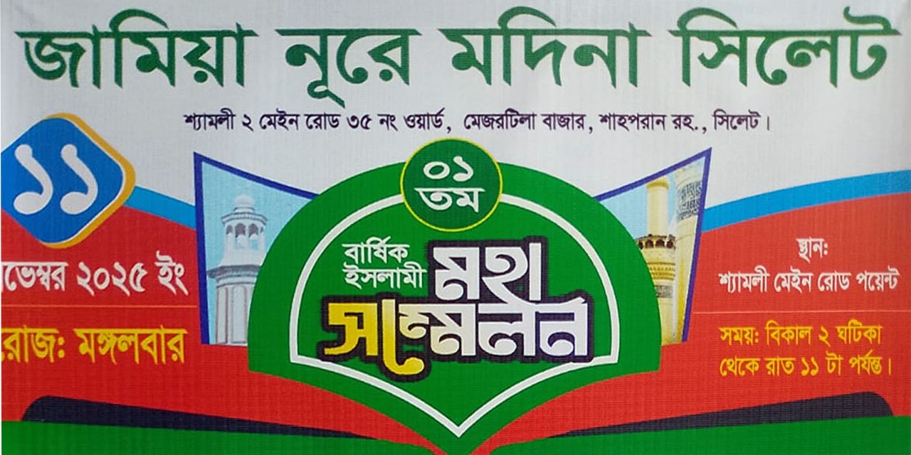 সিলেট নগরীর শাহপরান রহ থানাধিন ৩৫নং ওয়ার্ডের মেজরটিল, ইসলামপুরের শ্যামলীস্থ জামিয়া নূরে মদিনা সিলেট এর বার্ষিক ইসলামী মহাসম্মেলন আজ ১১ নভেম্বর মঙ্গলবার শ্যামলী মেইন রোড পয়েন্টে বিকাল ২টায় শুরু হয়ে রাত ১১টায় শেষ হবে।