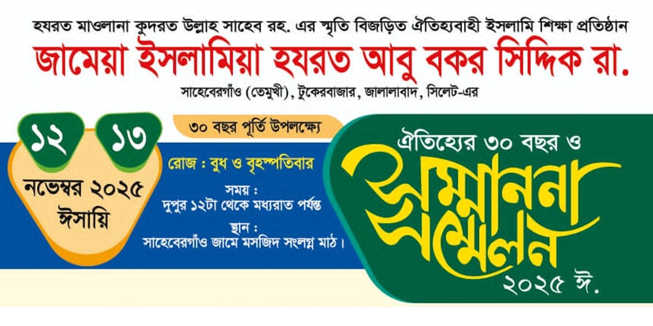 সিলেট সদর উপজেলার জালালাবাদ থানাধিন টুকেরবাজার তেমুখীর সাহেবেরগাঁওস্থ হযরত মাওলানা কুদরত উল্লাহ রহ. এর স্মৃতি বিজড়িত ঐতিহ্যবাহী ইসলামী শিক্ষা প্রতিষ্ঠান জামেয়া ইসলামিয়া হযরত আবু বকর সিদ্দিক রাঃ এর ২ দিনব্যাপী ৩০তম বার্ষিক ইসলামী মহাসম্মেলন আগামী ১২ নভেম্বর বুধবার ও ১৩ নভেম্বর বৃহস্পতিবার সাহেবেরগাঁও জামে মসজিদ সংলগ্ন মাঠে দুপুর ১২টা শুরু হয়ে মধ্যরাত পর্যন্ত অনুষ্ঠিত হবে।