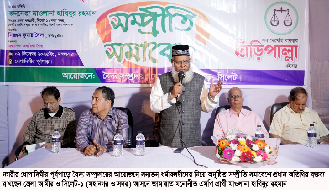 বিশিষ্ট মুরব্বী নিরঞ্জন কুমার বৈদ্য এর সভাপতিত্বে ও মদনমোহন কলেজের প্রভাষক অনামিকা বৈদ্য এর সঞ্চালনায় অনুষ্ঠিত সম্প্রীতি সমাবেশে উপস্থিত ছিলেন ও বক্তব্য রাখেন- শাহপরান পশ্চিম থানা জামায়াতের আমীর মো. শাহেদ আলী, জামায়াত নেতা হামিদ বক্স মুহিন, দেলোয়ার হুসেন, মাহফুজুর রহমান, দেওয়ান মঞ্জুর আহসান মিশু মলিন বৈদ্য, মিঠু বৈদ্য, লনিলাল বৈদ্য ও বাবুল বৈদ্য প্রমুখ।