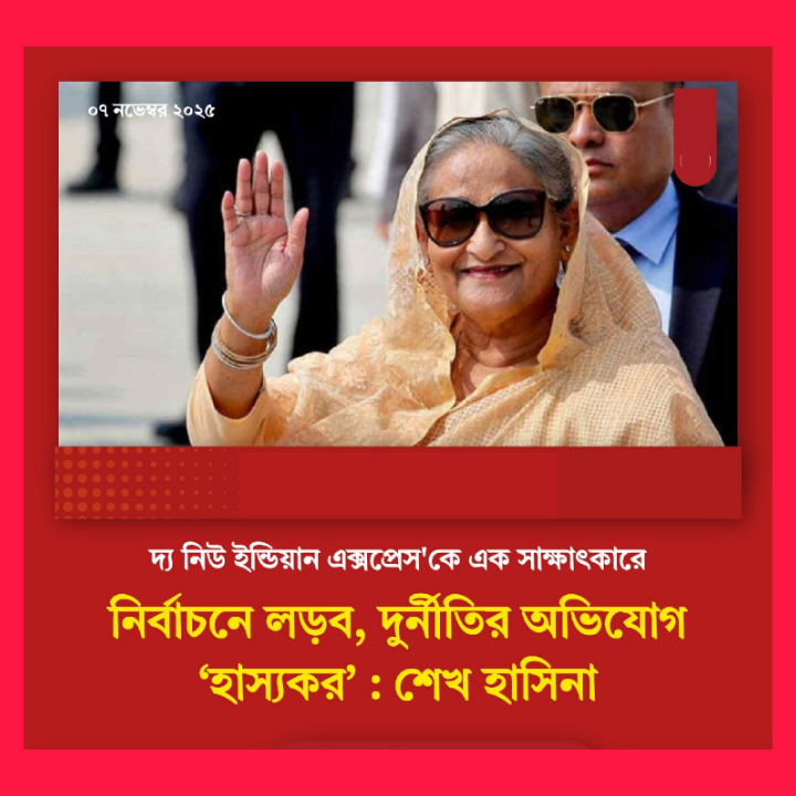 শিখাবিডি ডেস্ক :: বাংলাদেশের সাবেক প্রধানমন্ত্রী শেখ হাসিনা। ভারতের প্রভাবশালী গণমাধ্যম 'দ্য নিউ ইন্ডিয়ান এক্সপ্রেস'-কে দেওয়া এক বিশেষ সাক্ষাৎকারে তিনি রাজনীতিতে তার ভবিষ্যৎ পরিকল্পনা স্পষ্ট করেছেন। আগামী নির্বাচনে প্রতিদ্বন্দ্বিতা করার দৃঢ় প্রত্যয় ব্যক্ত করার পাশাপাশি তিনি তার সরকারের বিরুদ্ধে আনা ২৩৪ বিলিয়ন ডলারের দুর্নীতির অভিযোগকে 'হাস্যকর' বলে উড়িয়ে দিয়েছেন।