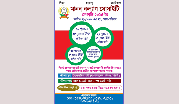 মানব কল্যাণ সোসাইটির উদ্যোগে মেধা বৃত্তি-২০২৫ আগামী ২৯ নভেম্বর (শনিবার) সিলেটের শিবগঞ্জস্থ সৈয়দ হাতিম আলী স্কুল এন্ড কলেজে অনুষ্ঠিত হবে। বাংলা, ইংরেজি, গণিত, সাধারণ বিজ্ঞান, বাংলাদেশ ও বিশ্বপরিচয় বইয়ের উপর মোট ১০০ নম্বরে পরীক্ষা চলবে সকাল ১০টা থেকে দুপুর ১টা পর্যন্ত।