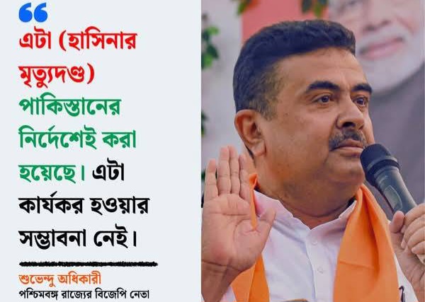 শুভেন্দু অধিকারী এএনআইকে বলেন, ‘এটা পাকিস্তানের নির্দেশেই করা হয়েছে। এটা কার্যকর হবে না। শেখ হাসিনা অন্য দেশের হলেও তিনি বাঙালির সংস্কৃতির সঙ্গে যুক্ত।