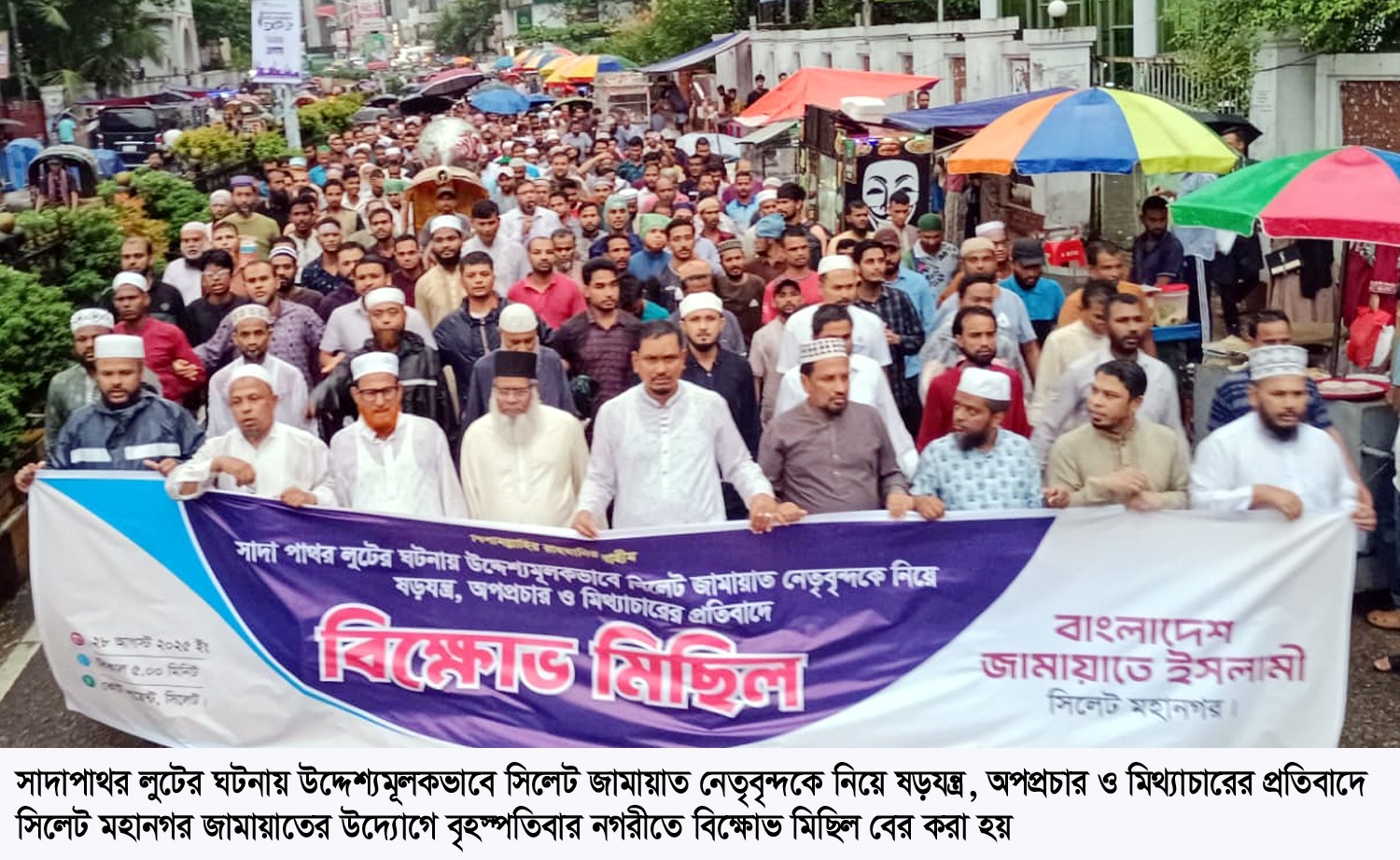 তিনি বৃহস্পতিবার (২৮ আগস্ট) বিকেলে সাদাপাথর লুটের ঘটনায় উদ্দেশ্যমূলকভাবে সিলেট জামায়াত নেতৃবৃন্দকে নিয়ে ষড়যন্ত্র, অপপ্রচার ও মিথ্যাচারের প্রতিবাদে সিলেট মহানগর জামায়াত আয়োজিত মিছিল পূর্ব সংক্ষিপ্ত সমাবেশে প্রধান অতিথির বক্তব্যে উপরোক্ত কথা বলেন। বৈরী আবহাওয়া বৃষ্টি উপেক্ষা করে মিছিলটি নগরীর কোর্টপয়েন্ট থেকে শুরু হয় গুরুত্বপূর্ণ পয়েন্ট প্রদক্ষিণ শেষে চৌহাট্টা পয়েন্টে গিয়ে সমাপ্ত হয়।