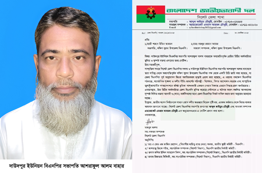 সিলেটের দক্ষিণ সুরমার দাউদপুর ইউনিয়ন বিএনপির সভাপতি আশরাফুল আলম বাহারকে তার দায়িত্ব থেকে অব্যাহতিপূর্বক একটি চিঠি গত ২৮ সেপ্টেম্বর দক্ষিণ সুরমা উপজেলা বিএনপির পক্ষ থেকে পাঠানো হয়। যা সিলেট জেলা বিএনপির পূর্ব অনুমোদন কিংবা অবহিতকরণ ছাড়াই প্রেরণ করা হয়েছে। দক্ষিণ সুরমা উপজেলা বিএনপির সভাপতি হাজী সাহাব উদ্দিন ও সাধারণ সম্পাদক বজলুর রহমান ফয়েজ স্বাক্ষরিত এ ধরনের প্রদক্ষেপ বিএনপির গঠনতন্ত্র, সাংগঠনিক শৃঙ্খলা ও দলীয় নীতি-আদর্শের পরিপন্থী।
