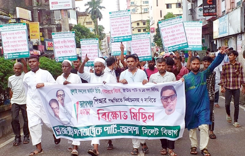 জাতীয় গণতান্ত্রিক পার্টি-জাগপা’র কেন্দ্রীয় কর্মসূচীর অংশ হিসেবে সিলেট জেলা ও মহানগরের উদ্যোগে জুলাই সনদের আইনি ভিত্তি, গণহত্যার বিচার, জাতীয় পার্টি ও ১৪ দল নিষিদ্ধ এবং পিআর পদ্ধতিতে নির্বাচনসহ ৭ দফা দাবিতে বিক্ষোভ মিছিল ও সমাবেশ অনুষ্ঠিত হয়েছে।